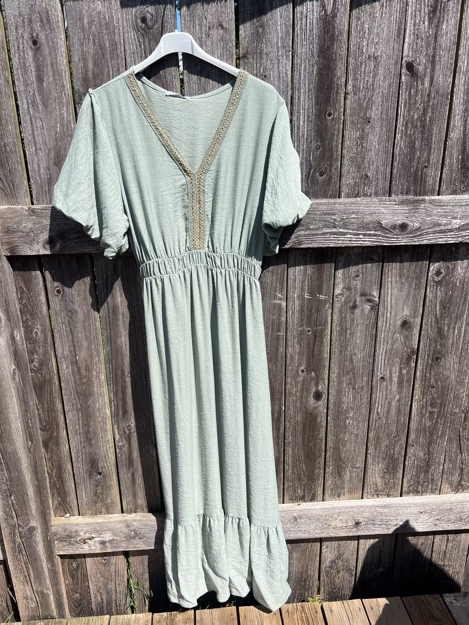Linne klänning Vilken härlig ljus grön linne klänning vi har fått in.Med detta fina guld brodyr i v-ringningen behöver du inte ens sätta till smycken. 599 kr 419 kr Storlek Onesize LÄGG I KORGEN